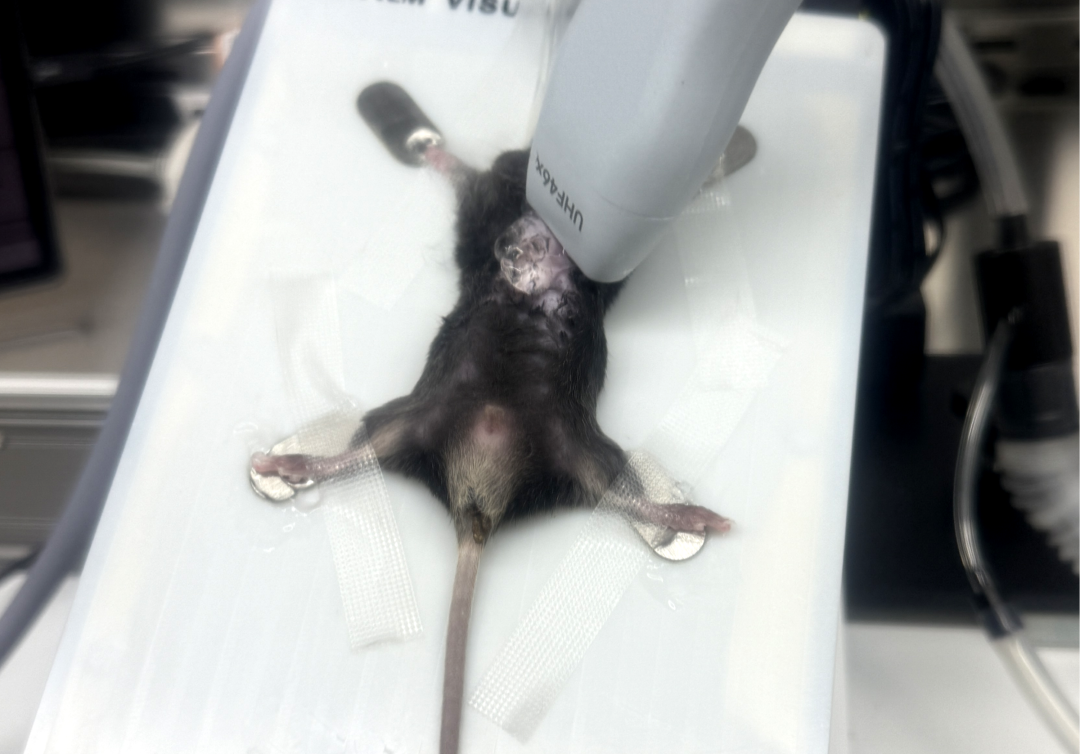 正式开机操作前,轻抓小鼠并固定,使用脱毛膏将小鼠胸前毛发涂抹去除。按照仪器使用说明依次将小动物超声仪及气麻机开机,检查麻醉机麻醉剂是否充足,小动物超声仪生理监测系统显示是否正常,并调整操作台。其生理监测系统可监测心率变异性与心律失常,小鼠板的体温调控可范围覆盖28-42℃,保证麻醉小鼠维持在正常体温范围,呼吸节律传感器精度达±0.2次/分钟,有助于我们实时监测以维持小鼠最佳生理状态。