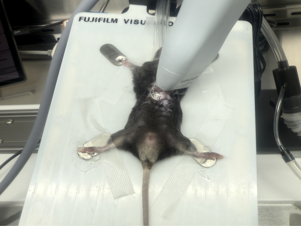 SPF级小鼠、Fujifilm VisualSonics研发团队的VeVo F2小动物超声成像系统、小动物气体麻醉机、脱毛膏、耦合剂、导电膏、棉签、胶布、镊子。