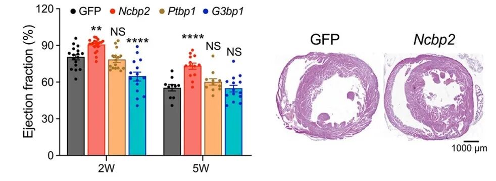 NCBP2过表达导致小鼠心脏射血分数(EF)显著升高(2周时由80.26%升至90.36%,5周时由55.38%升高至73.01%),左心室前壁厚度增加,与心脏成熟延迟表型一致。