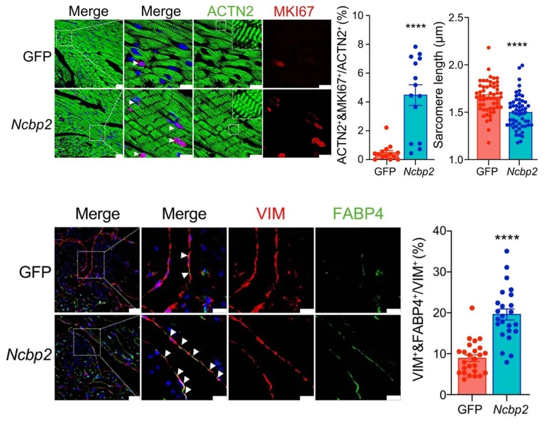 在新生心肌细胞中敲低NCBP2能显著抑制细胞增殖,增加肌原纤维束宽度和肌节长度,改善电生理功能(如缩短动作电位时程、提高去极化速度),促进心肌细胞结构和功能成熟。而在成年心肌细胞中过表达NCBP2,会导致心肌细胞成熟特征部分逆转。
