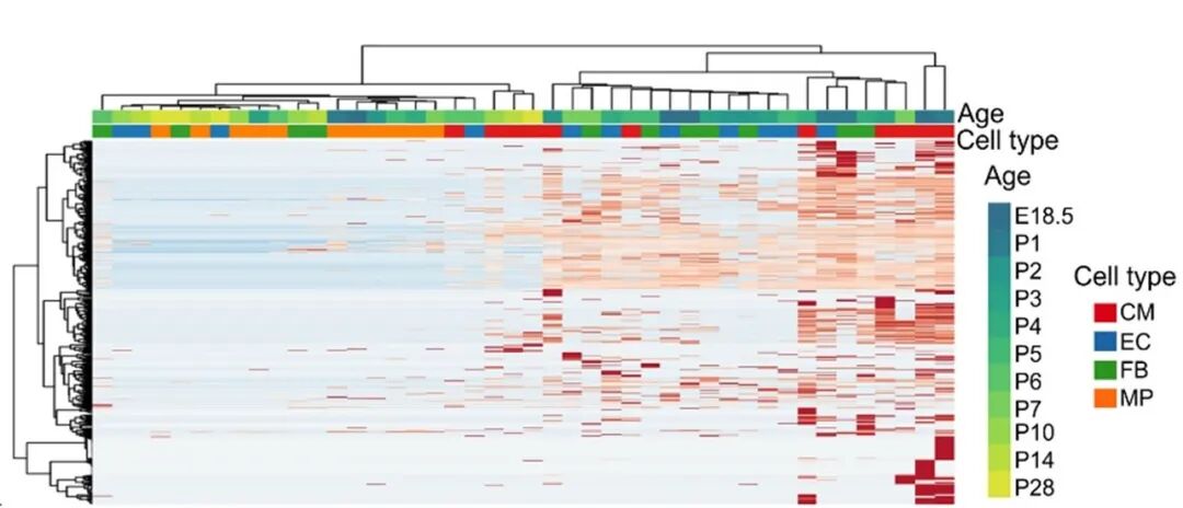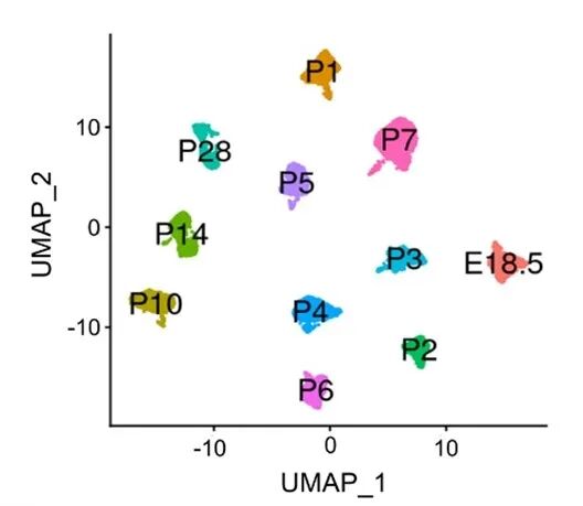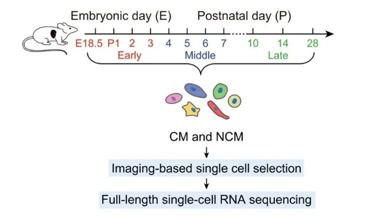 研究团队首先采用ICELL8单细胞测序平台(Takara Bio Japan),对小鼠出生后的关键阶段(P1-P7、P10、P14、P28)及胚胎期(E18.5)的心脏组织进行分析,构建了高分辨率的单细胞转录组图谱。