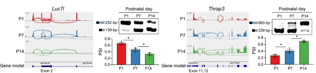 通过RT-PCR验证,Luc7l(参与肌生成的剪接因子)随成熟外显子2跳跃增加,PSI值降低;甲状腺激素受体相关蛋白3(Thrap3,一种RNA结合蛋白)随着成熟外显子11-12纳入增加,PSI值升高,与测序结果完全一致。