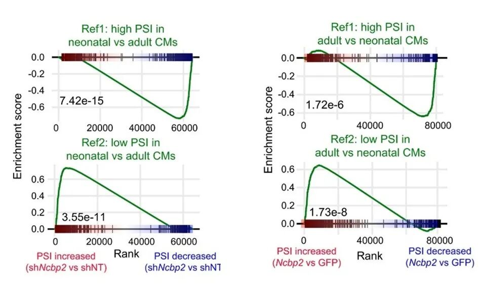 RNA-seq分析显示,NCBP2敲低对心肌细胞转录组的影响主要体现在剪接水平而非转录水平。NCBP2敲低的新生心肌细胞,其SE图谱与成年心肌细胞更相似;而NCBP2过表达的成年心肌细胞SE图谱向新生心肌细胞特征偏移。