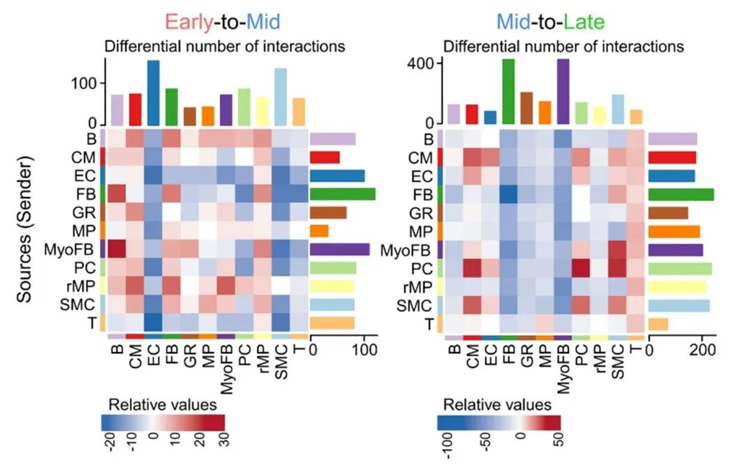 早期→中期:心肌细胞与免疫细胞互作显著增强(占上调互作的23.56%和79.73%),血管细胞互作减弱(占下调互作的80.88%),提示出生后初期,免疫细胞可能参与心脏“启动成熟”;