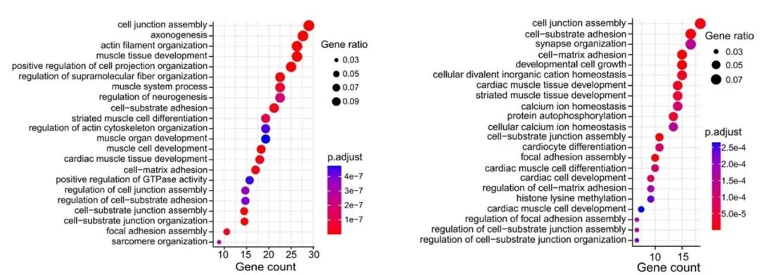 通过CLIP-seq鉴定NCBP2的直接结合靶标,与差异剪接基因(DSG)重叠得到311个(敲低)和239个(过表达)核心靶基因,这些基因富集于肌细胞发育和细胞骨架组织等心脏成熟相关通路。进一步筛选出91个共同靶基因,包括心脏成熟相关基因Ttn、Camk2d等,其剪接模式在NCBP2敲低和过表达时呈相反变化。