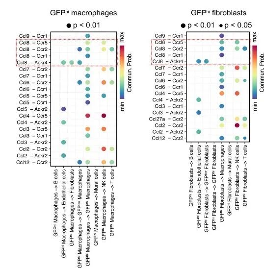 图3 GFPhi巨噬细胞和成纤维细胞的CCL信号传出模式图