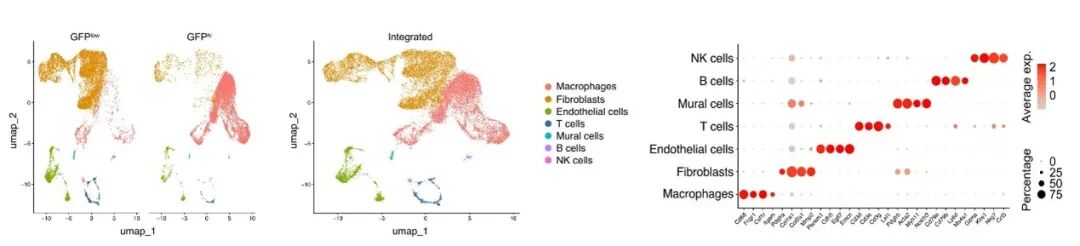 研究团队利用单细胞测序技术,对小鼠心肌梗死后第7天的心脏非心肌细胞进行解离,共捕获20040个高质量细胞,覆盖巨噬细胞、成纤维细胞、T细胞、NK细胞等7种主要细胞类型。