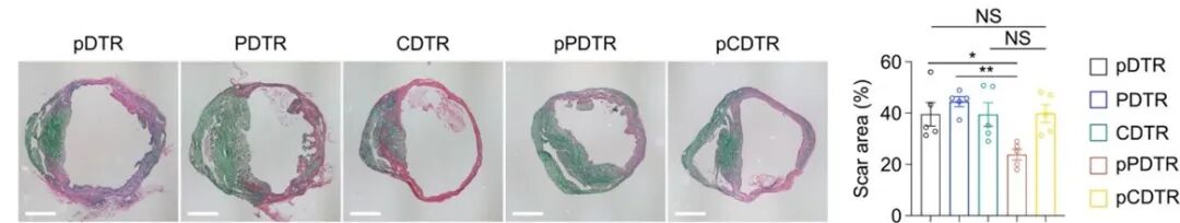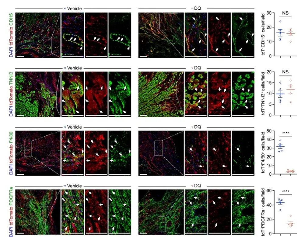 P16+成纤维细胞清除:利用双重组酶系统(p16-DreER;Pdgfra-CreER;R26-Ir-tdT-DTR小鼠)选择性清除P16+成纤维细胞,结果显示纤维化面积减少,心功能提升。