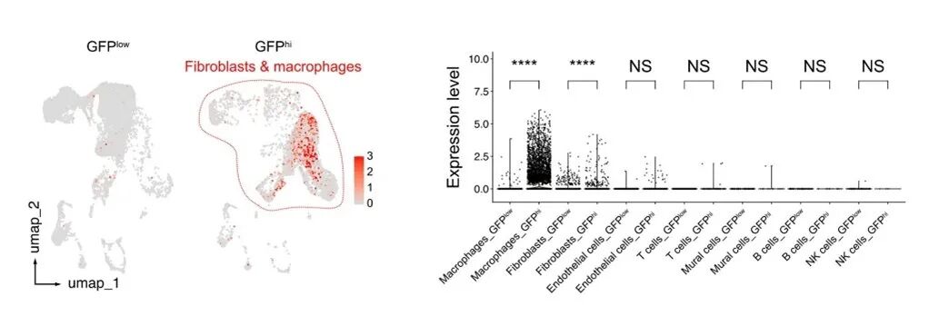 图5 GFPhi巨噬细胞和成纤维细胞中CCL8的表达分布图