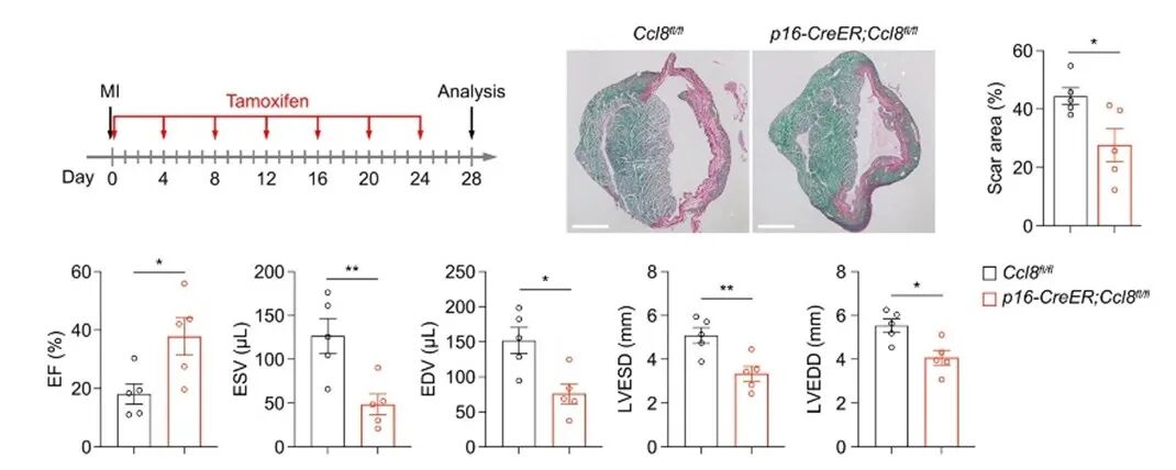 CCL8基因敲除:在P16+细胞中特异性敲除CCL8,结果显示CD8+ T细胞与NK细胞浸润减少,心功能改善,纤维化面积显著减少。
